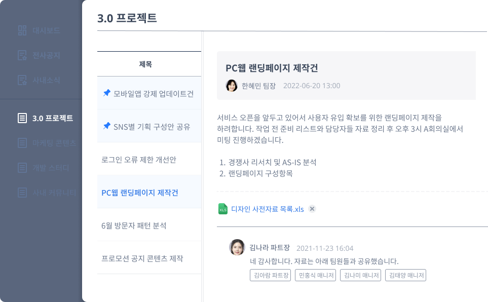 신속한 의사결정을 진행할 수 있고, 게시판을 통해 협업을