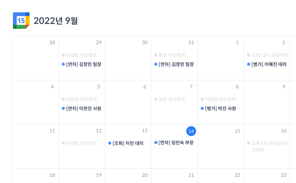 구글 캘린더와 연동하는 기능은 꼭 활용하시길 바랍니다. 출장이나 휴가 일정 등 누가 언제 다녀왔는지 한눈에 볼 수 있는 건 업무시간을 생각보다 드라마틱하게 줄여줍니다.